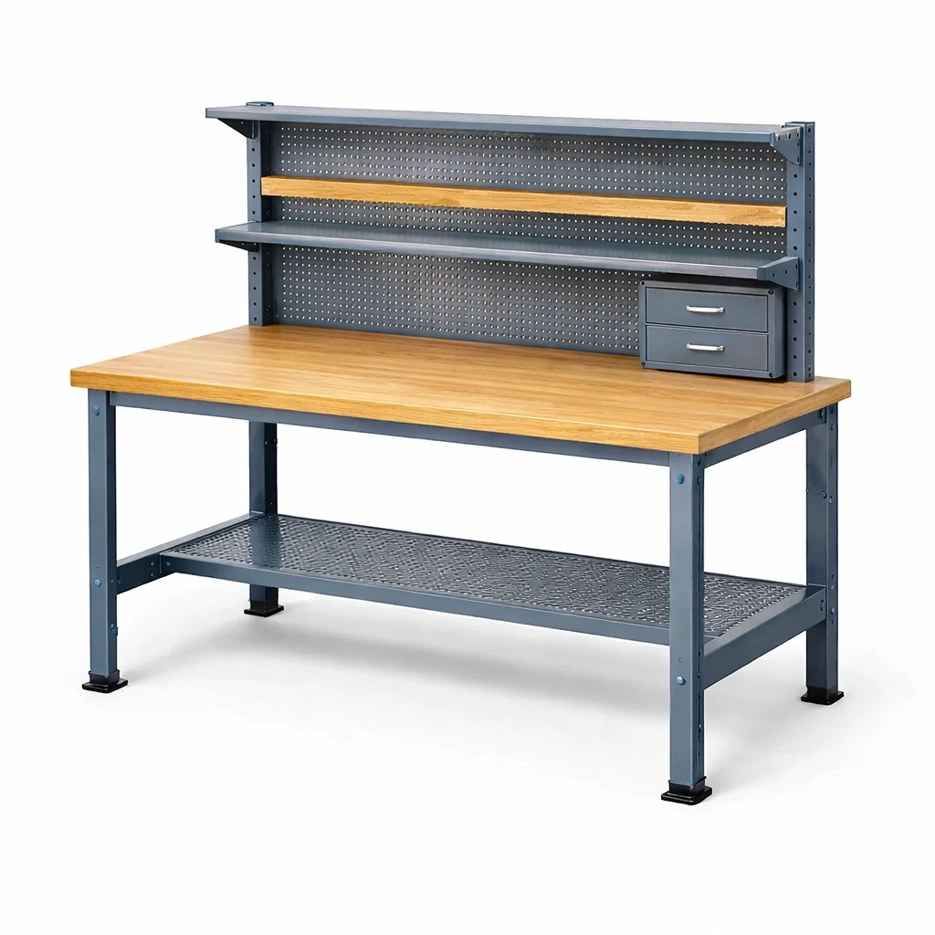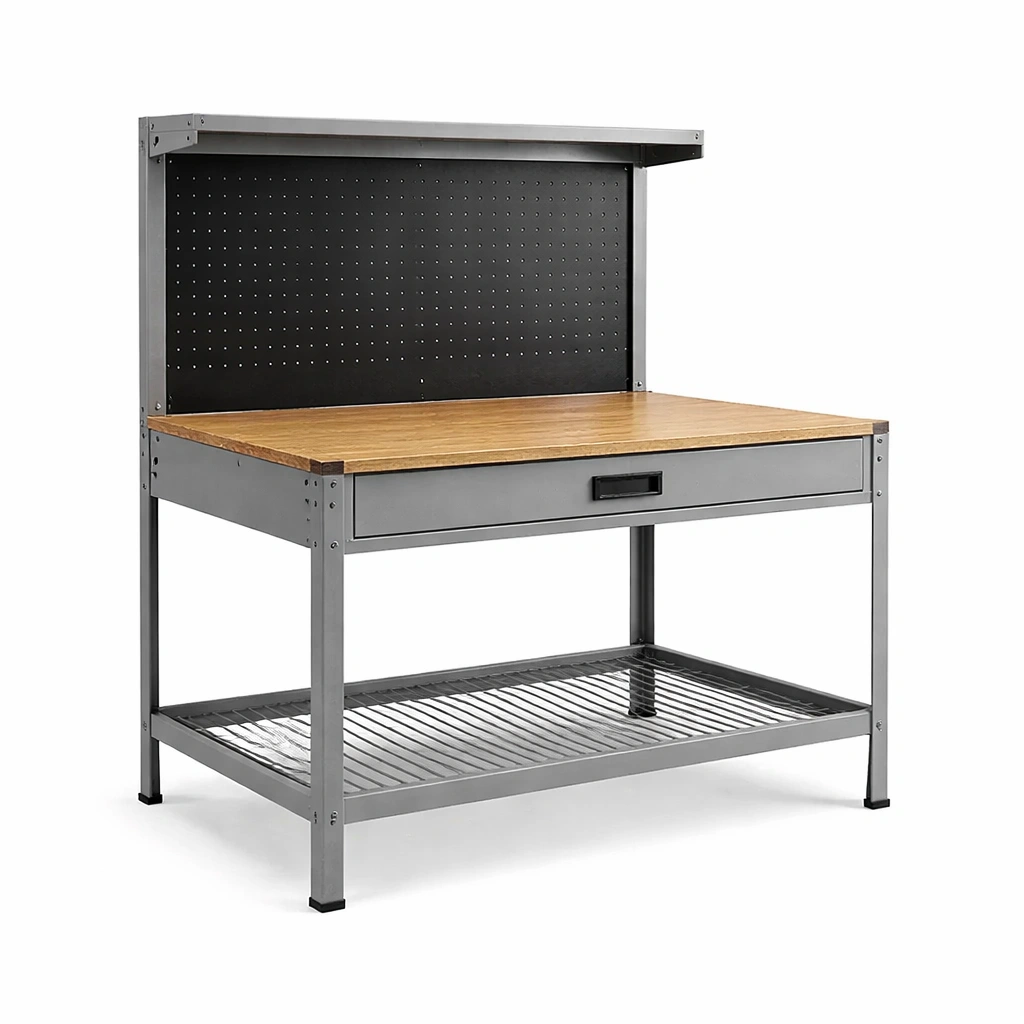 Banco da lavoro in legno e metallo con ripiano forato